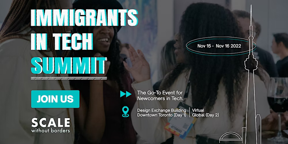 On November 15th-16th 2022, Scale Without Borders, is bringing the entire immigrant tech community — key corporate leaders, leading startups, government and non-profit — to support, celebrate, and hire the brightest immigrants in tech. With day 1 hosted at the Design Exchange (the iconic Toronto Stock Exchange site), taking over the historic trading floor and exhibition hall, and day 2 hosted on our highly sophisticated event platform in partnership with Pheedloop, we will be joined by thousands across Canada and many tuning in from abroad.